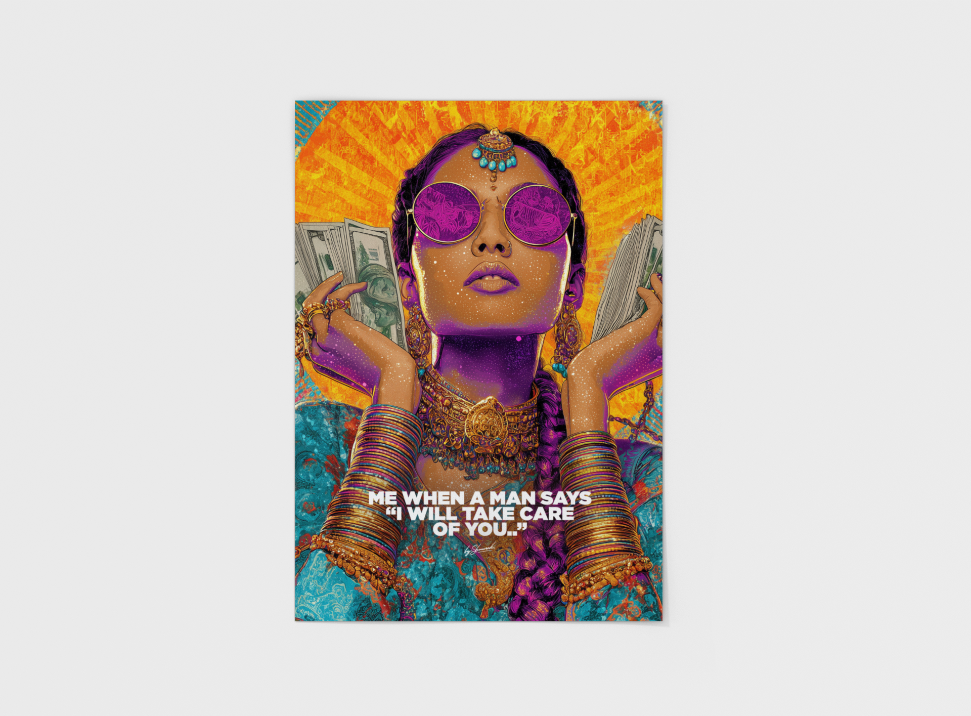 TAKE CARE is a vibrant declaration of self-worth and independence. Drenched in radiant color and modern desi attitude, this striking artwork flips the script on empty assurances, replacing promises with power. Confident, unapologetic, and dripping in style, it captures the moment you realize you don’t need saving — you’ve already got yourself.